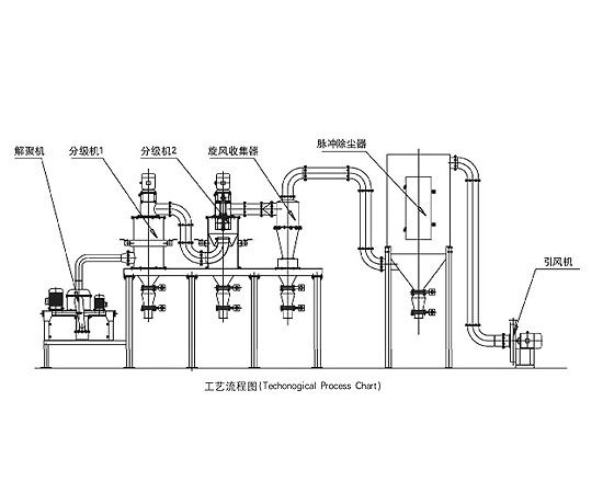 該生產線由解聚機、分級機、旋風收集器、脈沖除塵器、引風機、電控柜等組成,物料由原料倉進入解聚機進行粉碎,粉碎后的物料在引風機引力的作用下經輸料管進入分級機分級,符合粒度要求的產品進入旋風收集器收集,粗料從分級機下口排出,過細的粉料在脈沖除塵器收集,潔凈的氣體由引風機排出。
